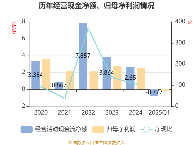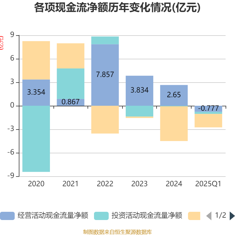 截至2025年一季度末容新策略,公司经营活动现金流净额为-7773.36万元,同比增加7980.26万元;筹资活动现金流净额-1.72亿元,同比增加1.17亿元;投资活动现金流净额-2631.73万元,上年同期为1.08亿元。