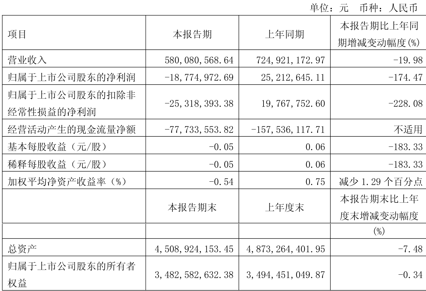 中证智能财讯香飘飘(603711)4月26日披露2025年第一季度报告。公司实现营业总收入5.8亿元,同比下降19.98%;归母净利润亏损1877.5万元,上年同期盈利2521.26万元;扣非净利润亏损2531.84万元,上年同期盈利1976.78万元;经营活动产生的现金流量净额为-7773.36万元,上年同期为-1.58亿元;报告期内,香飘飘基本每股收益为-0.05元,加权平均净资产收益率为-0.54%。