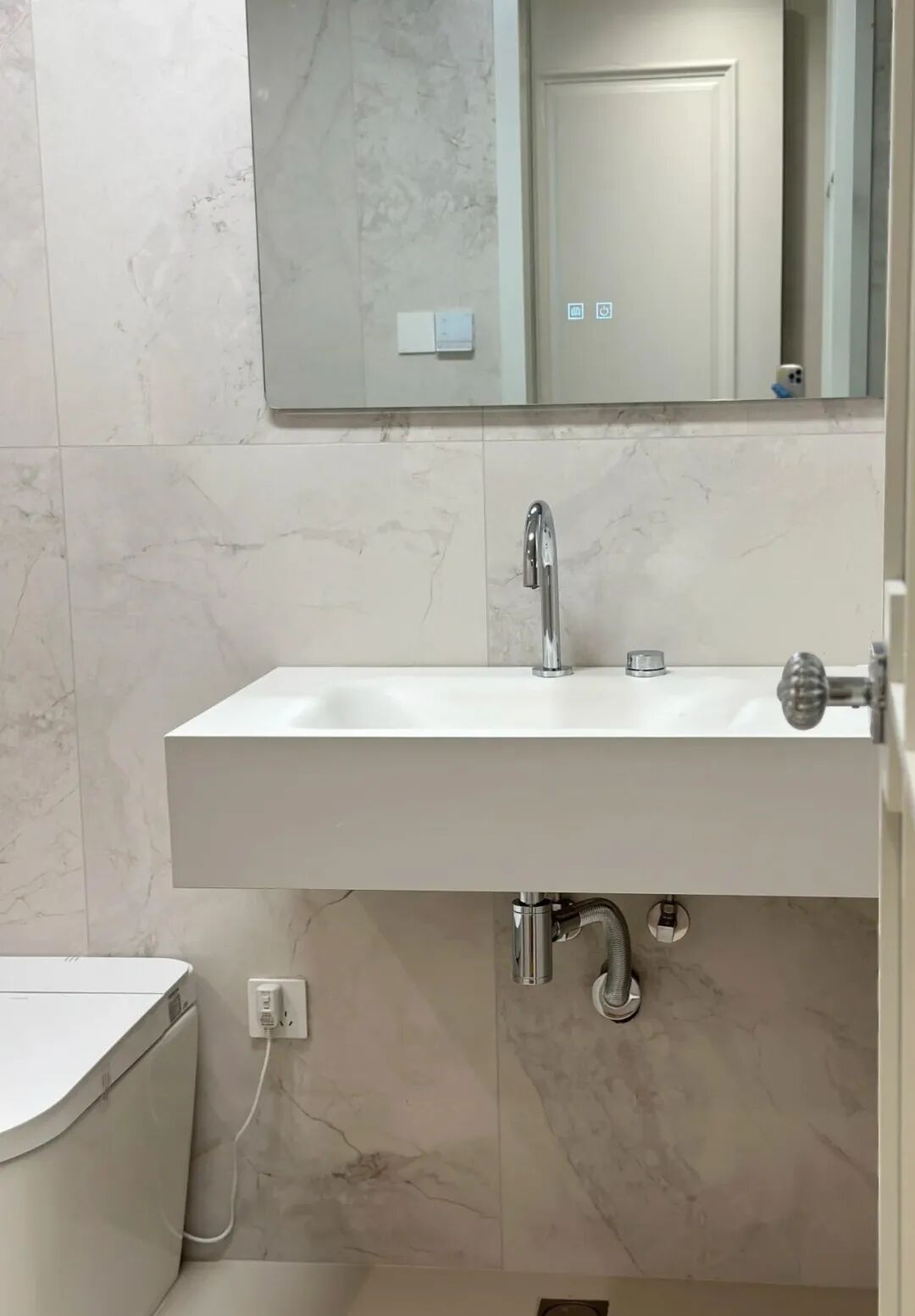 全陶瓷一体盆:实在担心浴室柜受潮发霉,那就选全陶瓷一体盆更省心,直接悬空安装,配上墙排下水管,底部空荡荡的没有卫生死角,擦地时随便一划就干净。